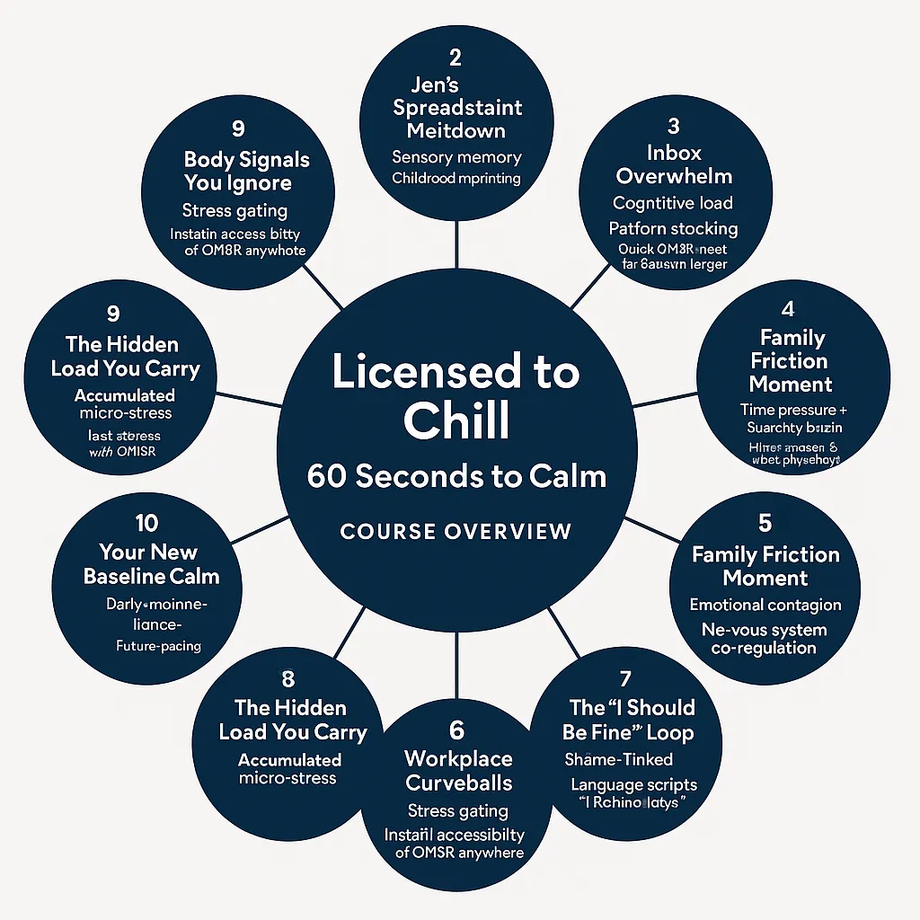 Ten bite-size lessons (with real-world examples) that teach the OMSR™ reset, stealth calming tactics, and habit-stacking for everyday life. Included inside the free membership portal.